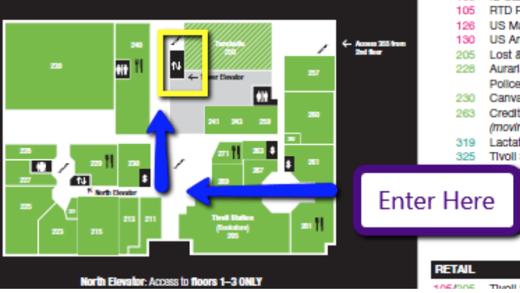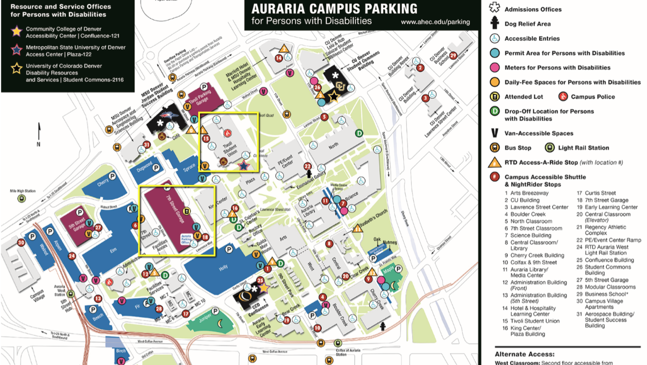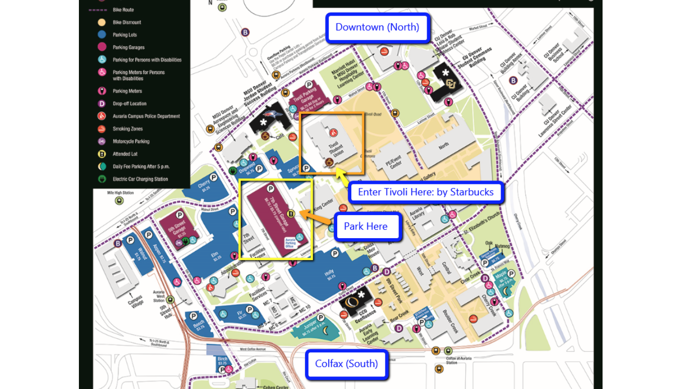 ** We will be starting our day in the Tivoli, 900 Auraria Pkwy, Suite 640. We have included a few maps in the pictures above to help guide you. Please consult with your coordinator as to how you will be arriving at the Auraria Campus, we encourage taking public transportation or carpooling. A limited number of Parking Passes for the 7thStreet Garage will be provided for groups coming from CU Boulder, CSU, and DU if the light rail is not taken. Ask Alyssa Marks (MSU Denver Puksta Coordinator) when you arrive.